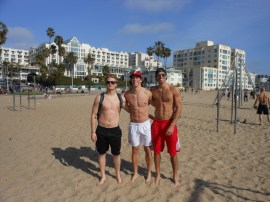 Sorry its late folks but we just finished our workout. For Day 116 of the 365 Day Challenge, Matt Edgar, Josh Edgar and Nick Karwoski went down to the Santa Monica Beach late on Tuesday evening after a busy day in Laguna. A good hike/rock jumping through the tide pools, driving range and 9 holes of golf where the loser had to buy margaritas for the winner. So after enjoying my margarita paid for by Matt and dinner in Newport Beach, we drove back to Santa Monica and headed to the outdoor jungle gym at the beach with pull up, balance, and climbing bars. 30 pull ups, 100 triceps dips, 25 chin ups, 110 push ups, 5 one-handed pull ups, pole climbing. Feeling very swollen. Hopefully be able to move our arms tomorrow.