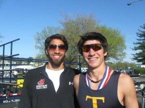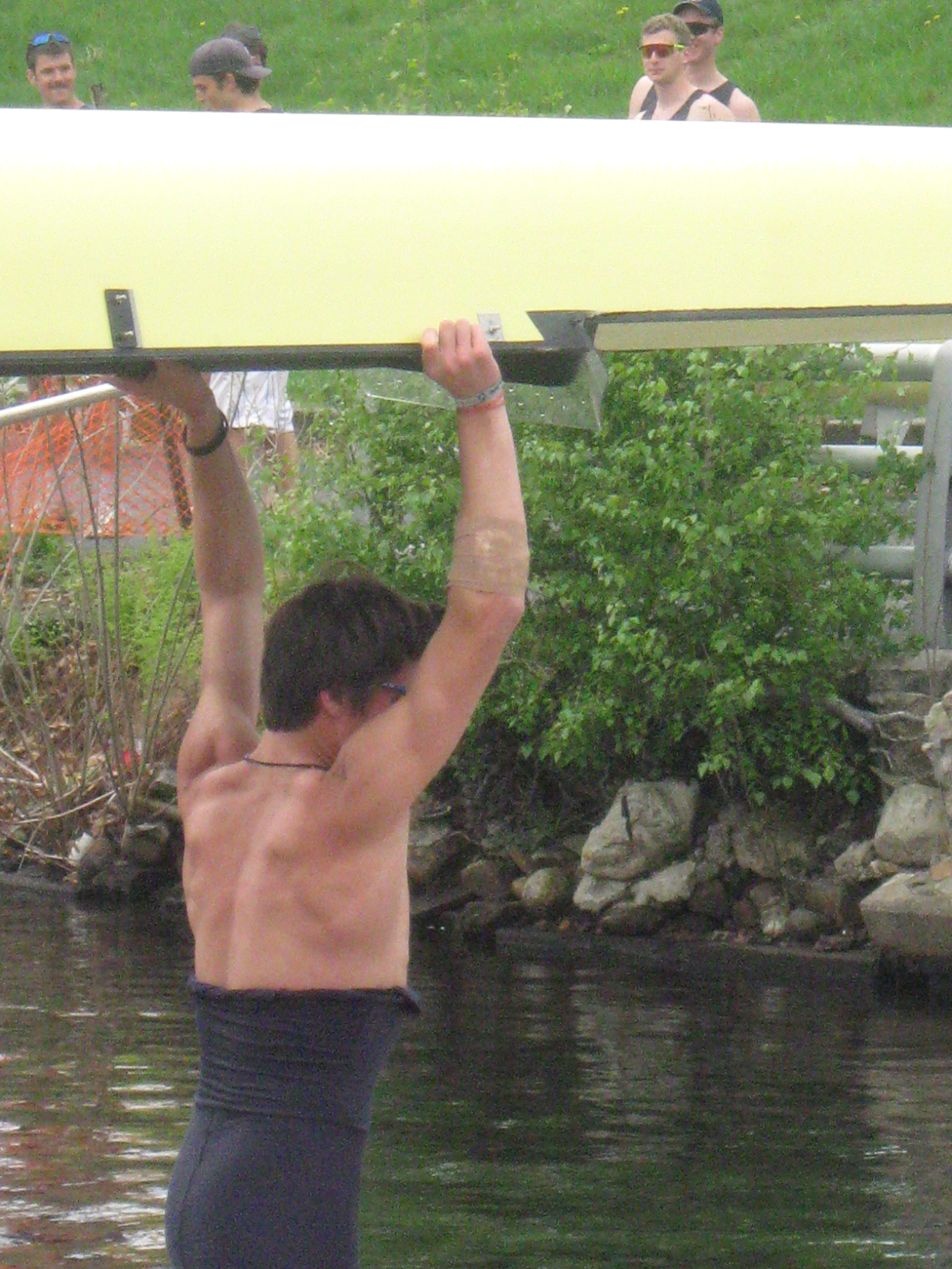 The team had a double row session today. On the water in the morning and another practice in the afternoon. Afterwards, then were on the ergs (rowing machine) and did a 1300m piece at their 2000m pace (roughly 6:05-6:15, translates to 1:32 per 500m). Then they paddled for 400m (which means an easy row to keep the body moving) followed by a sprint piece. The sprint was 300m with a partner on another machine. The catch (which is also a crew term for when the blade enters the water and the powerful start of the stroke begins) was that if either member of the two person team didn’t hit their target time, they had to do another 300m sprint.