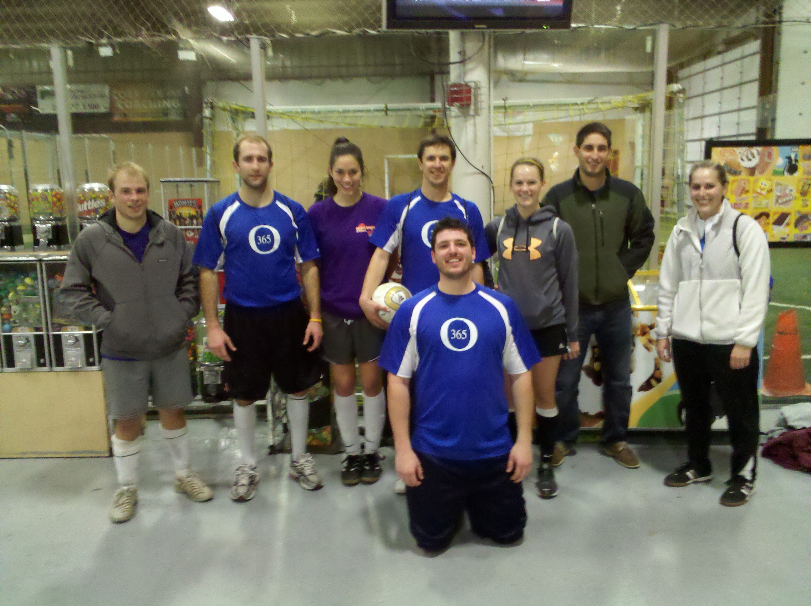 Here in Baltimore we try to vary our workouts each Sunday and change it up as much as possible.  Today some members of Team Baltimore played in an indoor soccer game.  It was a real nail biter, but in the end we came out on top 9-7. The highlight of the game came in the 30th minute with a left footed bomb from Graham Becker (pictured below holding the ball) from 30 yards out.  The MVP of the game was keeper, Tom Ripley (kneeling in the picture), who gave one of his most consistent performances of the year.  It was a team effort today, and everyone gave it their all – achieving not only the “W”, but also a great workout.