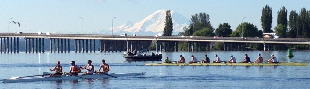 The 4- and the 8+ rowing this morning with the mountain in the background. Lining up for some 1000 meter pieces.