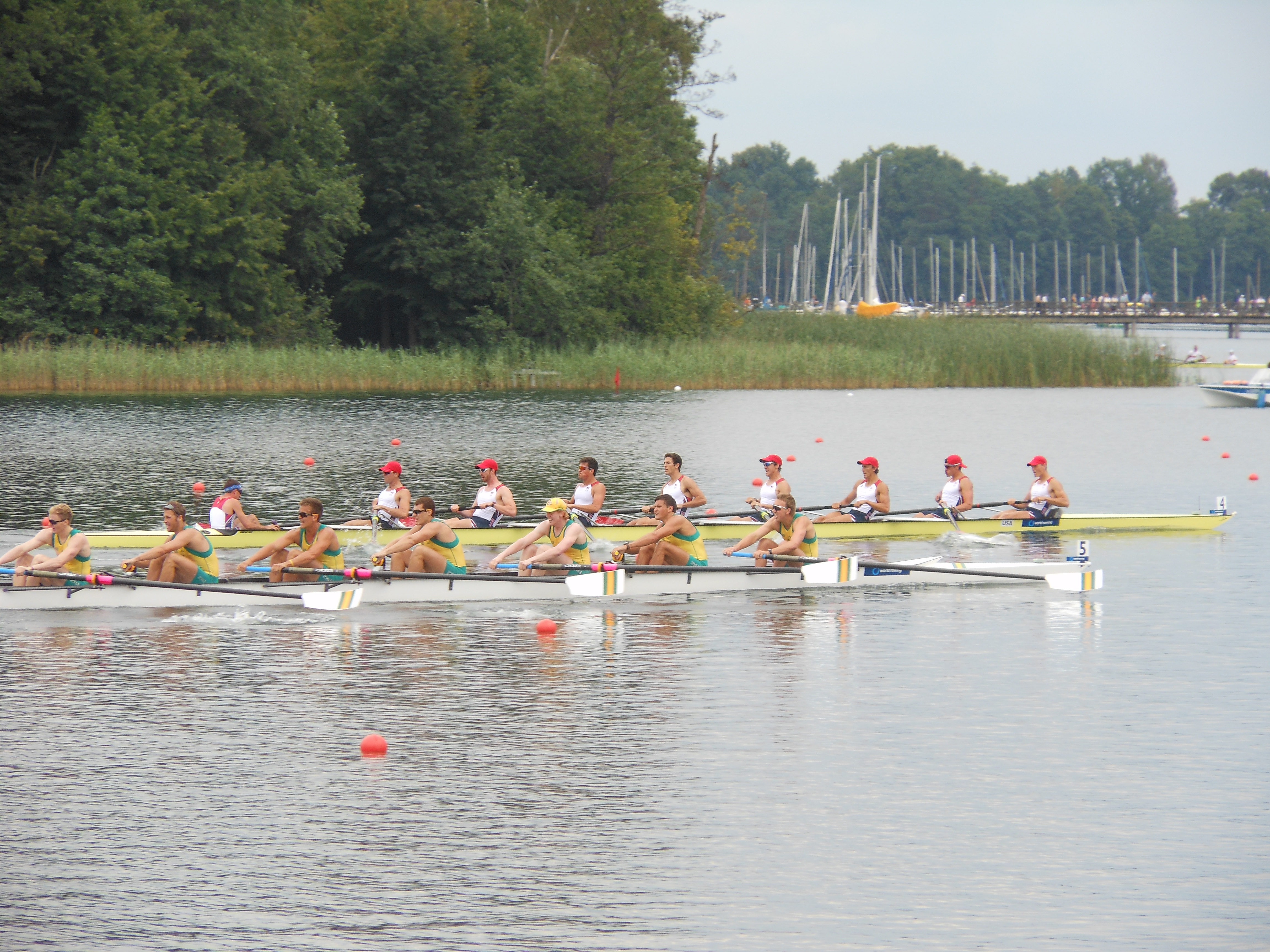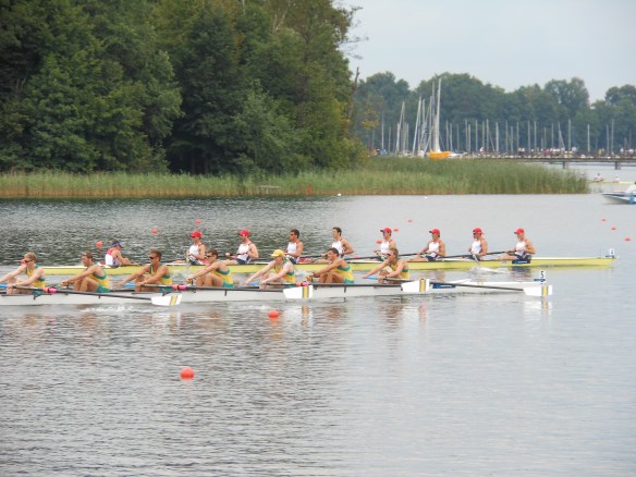 On Saturday, in the Grand Final, it was Germany, Great Britain, Australia, Spain, New Zealand and the United States of America racing for medals. The wind was blowing directly down the course for a 15mph headwind which made for slower times and longer races. At the start, Germany and Australia both blasted out of the blocks but we were right off of them and sitting in 3rd place. Through the 1500 m mark, we were holding 3rd but Great Britain was pushing on us – we started to execute our sprint by slowly bringing up our rating and with less than 100m left in the race, we were still holding the 3rd position by the smallest of margins. In the final 8 strokes of the race, Great Britain inched their bow ball ahead of ours and ended up beating us for the final medal spot by about 0.7 seconds.